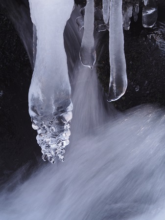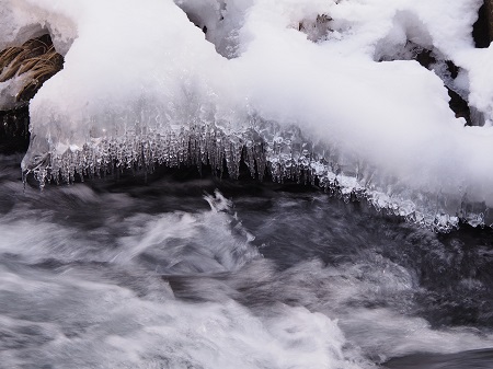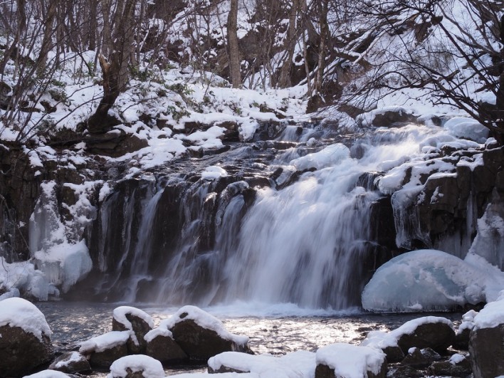 さすがに滝の本流は凍結していませんでしたが、滝の両サイドには氷柱、川の石は雪帽子、