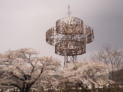 桜のトンネルを20分程歩いて行くと、レトロな塔が現れます。