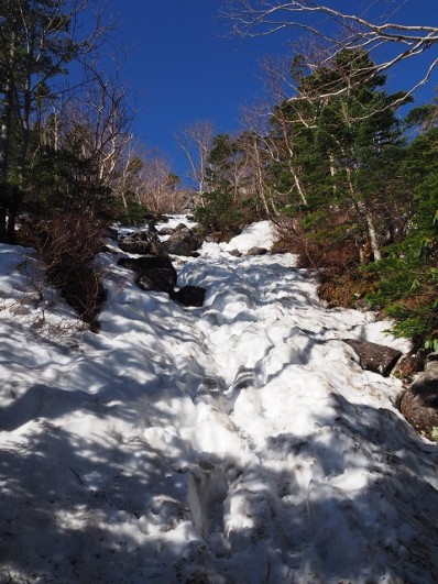 登山道の日陰の雪は日中溶けて夜凍りを繰り返しているのでちょっと厄介な雪で