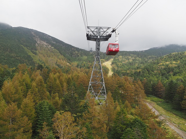 北八ヶ岳ロープウェイの車窓から見えるカラマツも少し色づいていました。