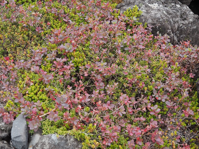 コメツツジが坪庭のあちらこちらで葉を赤く染めています。