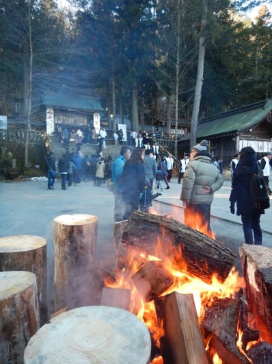 手水舎の前にはたき火があり、多くの方が手をかざし温まっていました。