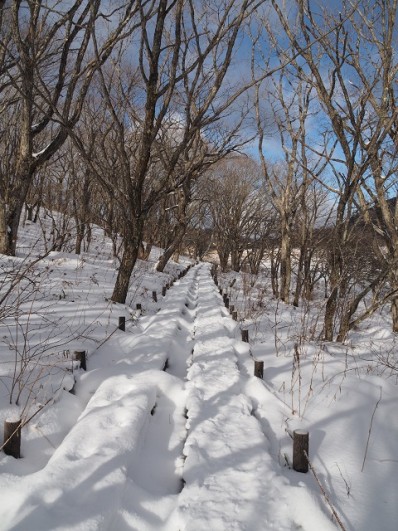 湿原の木道の上の雪は5cmから10cmほどでした。