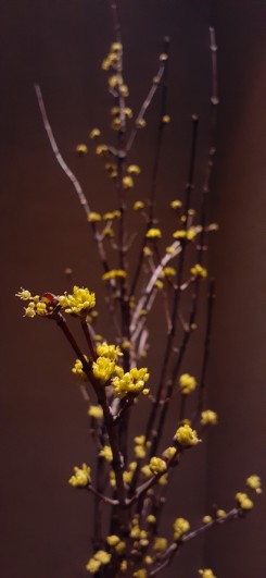 館内には、早春を代表する「山茱萸/サンシュユ」を生けました。