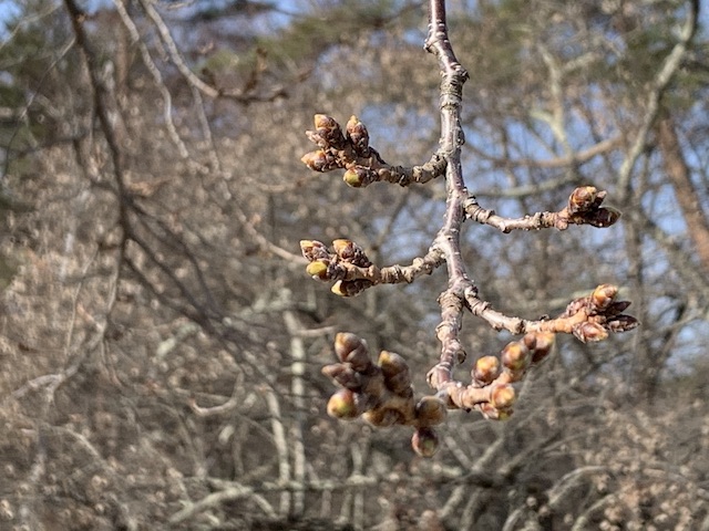 テラスの標本木?の山桜はまだ硬いつぼみのままですが、気持ち膨らんできた気がします。