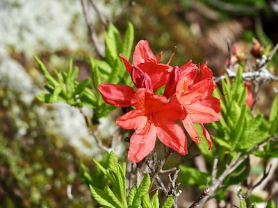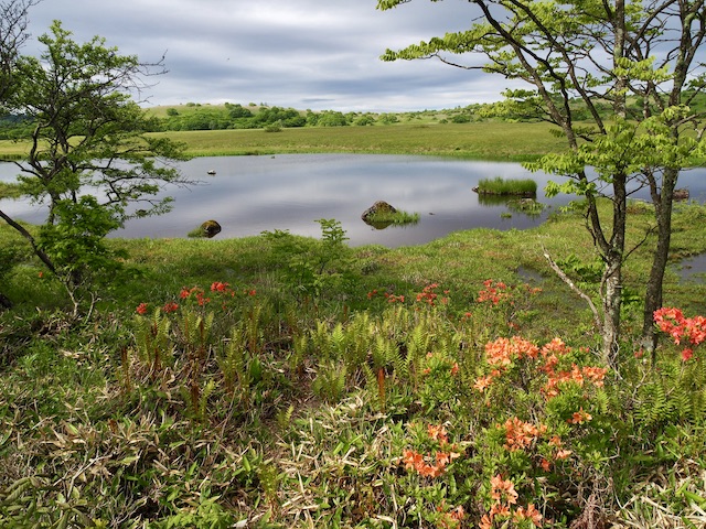 湿原を一周する木道沿いにはオレンジ色のレンゲツツジ、そして青紫色のあやめが