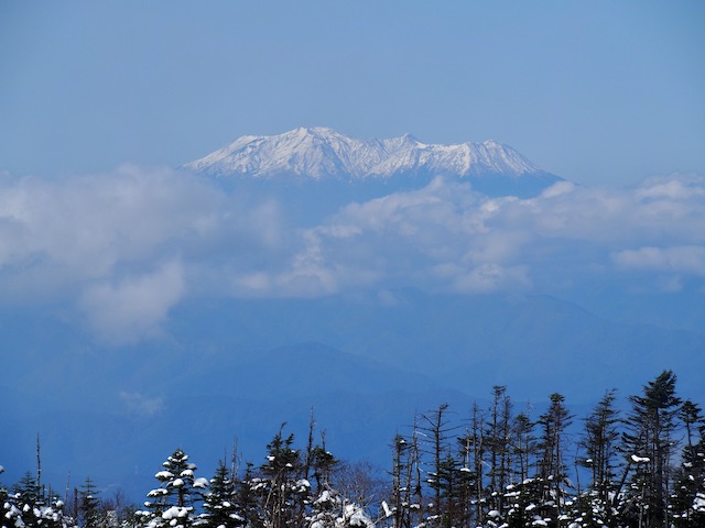 数分すると徐々にガスも晴れて来て、真っ白な帽子をかぶった蓼科山が顔を出してくれました。