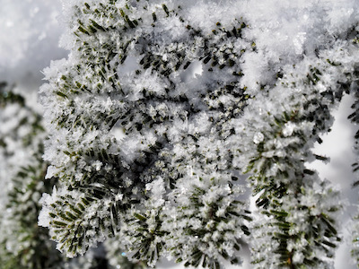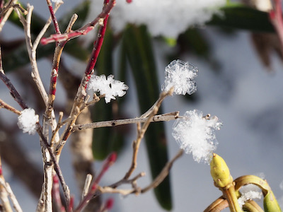 草木に花びらのように薄い雪(氷)の結晶が花を咲かせたようについていました。