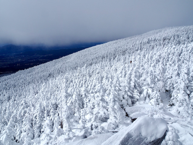 縞枯山へは山頂駅から雨池峠まで行き、そこから樹氷の間を40分ほど登って行きます。