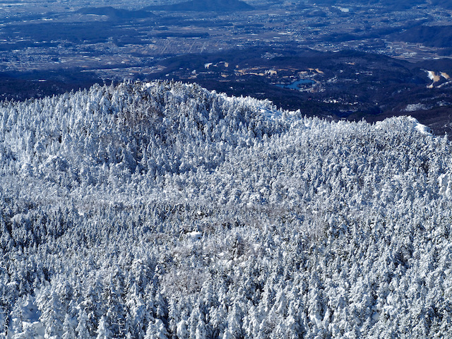 ふと視線を下に移すと樹海の背後に見慣れた湖が、蓼科湖が見えました。