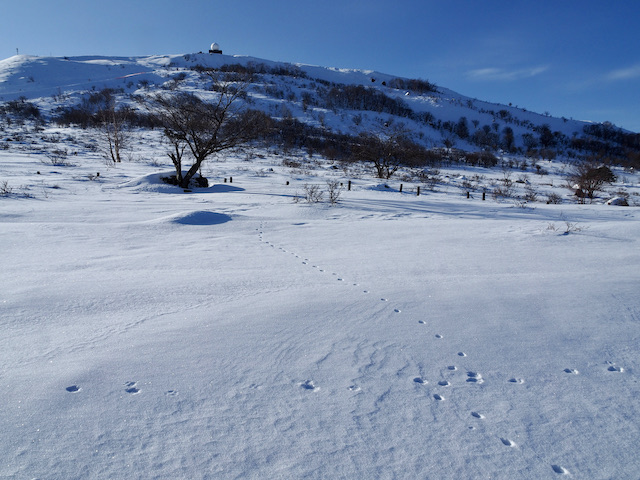 車山湿原の近くの遊歩道にはたくさんの動物達の足跡が。朝で人も居ない、もしかしたら