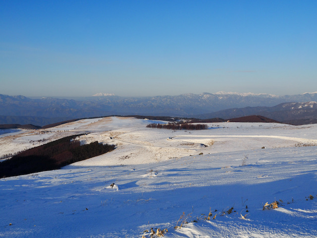 この日は快晴、途中、登山道からビーナスラインを見渡すと雪に覆われた霧ケ峰高原と
