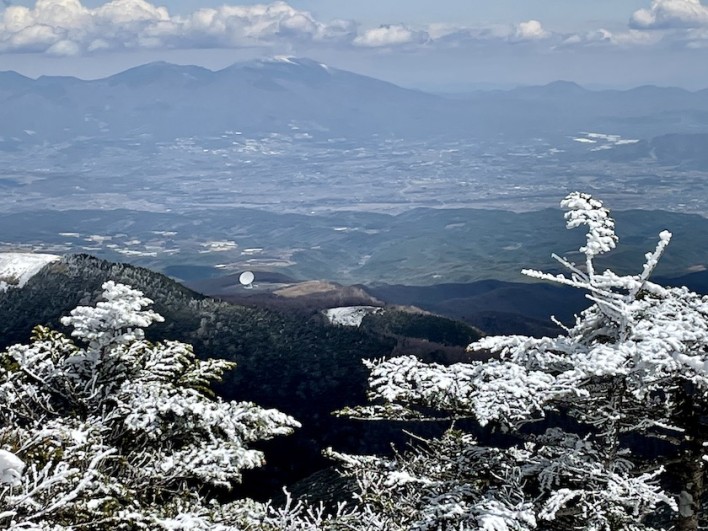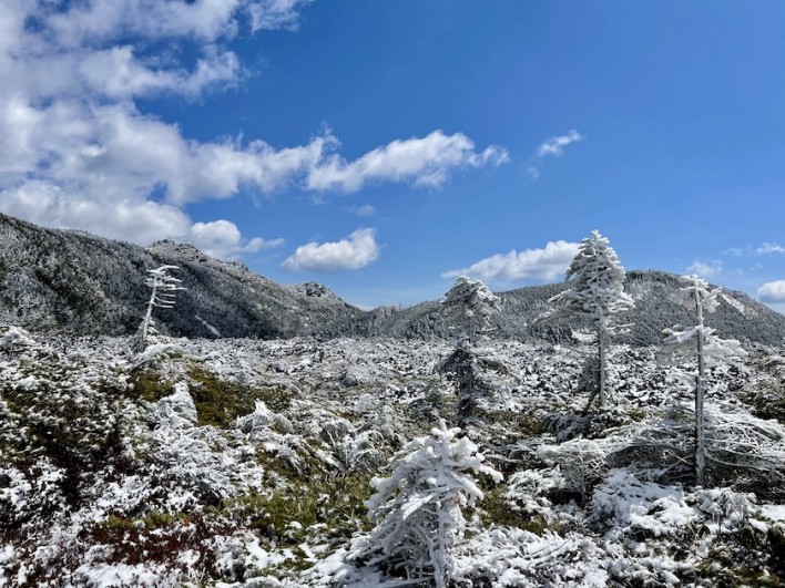 北八ヶ岳ロープウェイ山麓駅周辺には雪は残っていませんでしたが、ロープウェイが2000m付近を過ぎる頃から木々には樹氷が付いていました。
