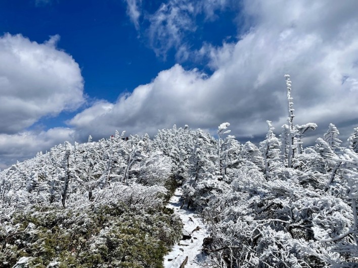 気温は意外と低く、日が当たり気温が上がると落ち始める樹氷も私が登っている間はほどんど落ちず、木に付いてままでした。