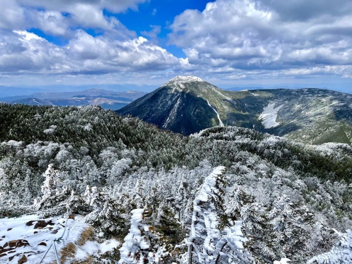 北横岳のお隣、蓼科山はくっきり。山頂の雪が帽子を冠っているみたいに見えます。