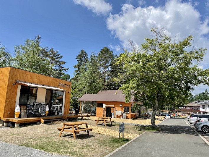お隣の蓼科アイスさん、公衆トイレと同じ木目調の蓼科の自然にマッチした建物になっています。