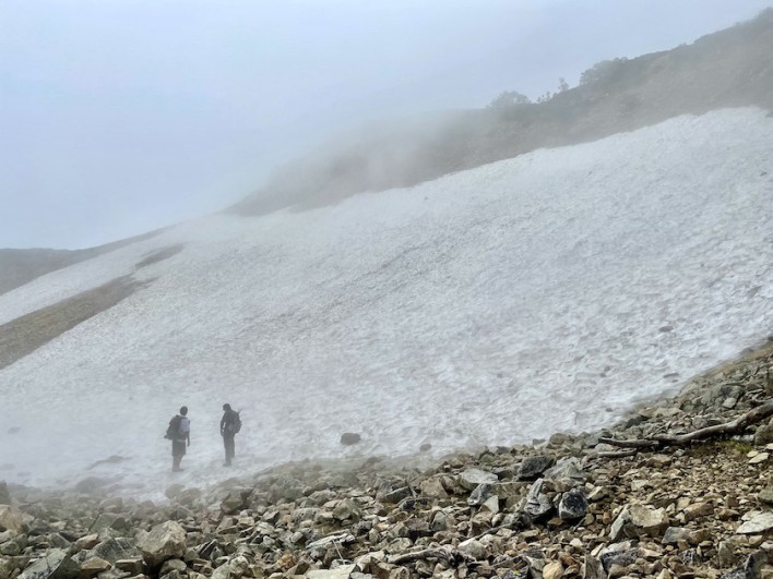 ここからが本格的な登山です。次の目標の丸山ケルンまでも約1時間。気温もかなり上がってきました。丸山ケルンの手前には扇雪渓があります。ここは雪渓から冷気が流れ涼しです。この辺りから少しガズが出てきました。