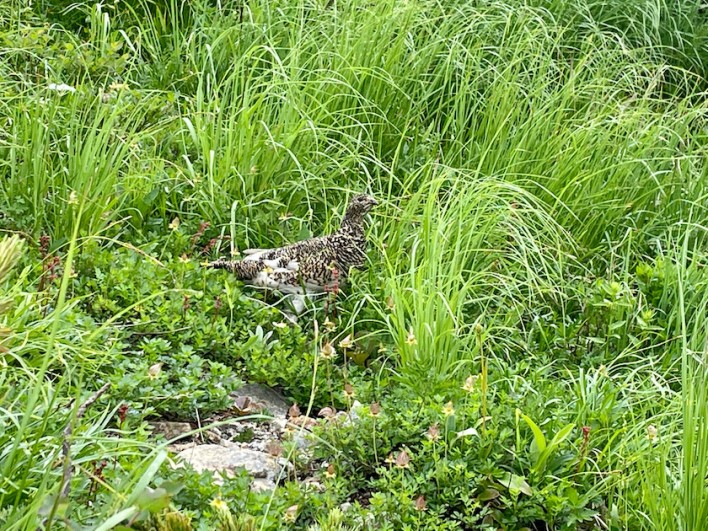 昨年登った時には会えませんでしたのでラッキーです。しばらく静かに様子を見守っているとさらに草むらの中で動くものが・・・ ピーピーとかわいい声が聞こえてきます。ちっちゃな雷鳥の子供達でした。草むらから数羽の雷鳥の子供達が見え隠れし始めました。残念ながら写真は撮れませんでした、ごめんなさい。