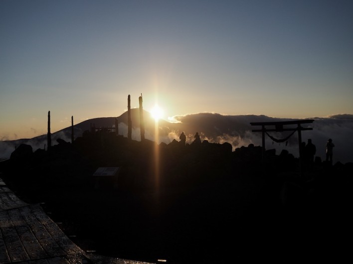 到着から10分ほどすると辺りも大分明るくなって来ました。ご来光の方向には雲も無く、綺麗な日の出が見れそうです。そして5時50分に蓼科山の裾野から太陽が登って来ました。