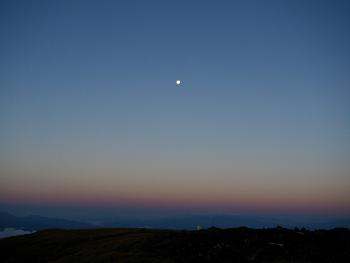 ヘッドライトをつけ4時50分ごろから登り始めました。暗闇に目が慣れてくるとライトが要らないことに気づきました。西の空に十五夜を過ぎたばかりの月が煌々と輝いているからです。