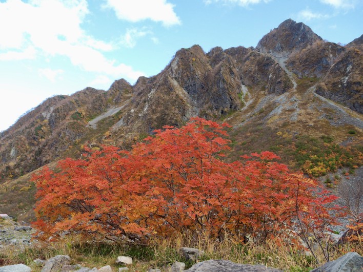 涸沢の紅葉で有名なのがナナカマド。赤やオレンジ色に葉が色づき、赤い実がアクセントになっています。そして今年はダケカンバの黄葉が目立っていました。