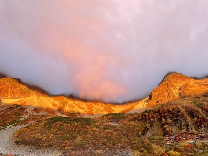 そしてもう一つは朝の穂高連峰のモルゲンロートです。モルゲンロートはドイツ語で朝の太陽の光が山を赤く染める事を言います。今回2泊内1日だけ見ることが出来ました。天候条件によって見れない日も多々ありますのでラッキーです。