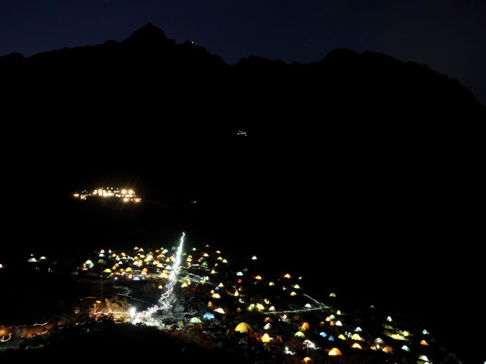 涸沢には名物がいくつかあります。その一つがテント村の夜の灯り。週末には500以上のテントが張られます。多い時には1000近くまで行く時もあるそうです。私が行ったのは平日だったので少なめでしたがそれでも100以上はあったと思います。