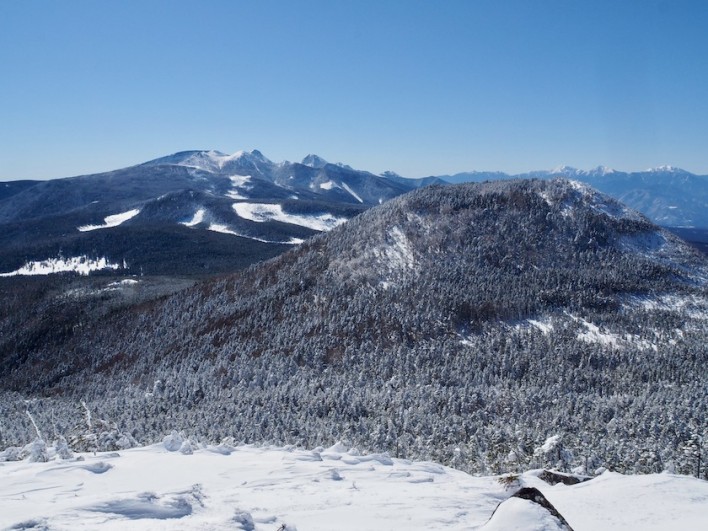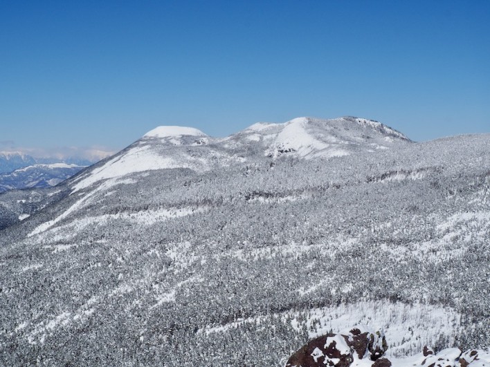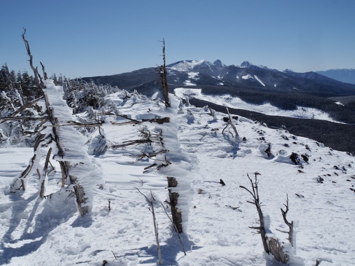 縞枯山の樹氷群と北横岳、その隣に蓼科山。