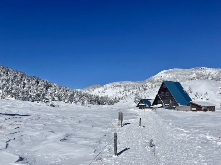 ますは平坦な雪道を雨池峠まで15分程歩きます。坪庭の横を通り樹氷の中を進み、10分程歩くと前が開けてきます。縞枯山荘の前を通り雨池峠に到着します。峠からは縞枯山、雨池、雨池山経由の北横岳と3方面に行く事が出来ます。