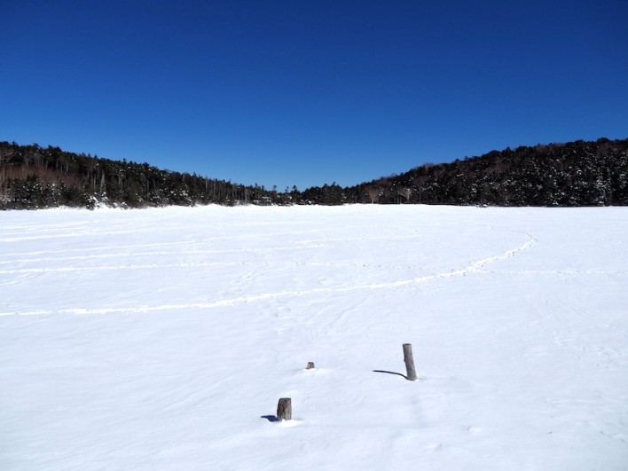 約30分で白駒池に到着。ここ数日降雪が無かったのか池の上には無数の足跡が散らばっていました。