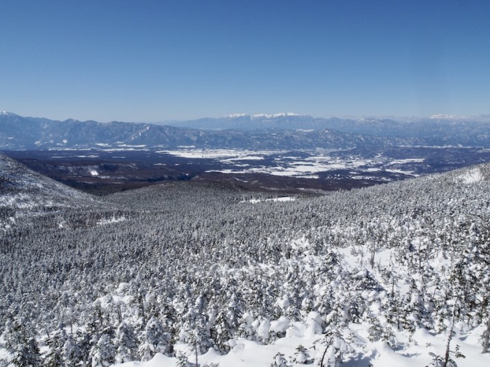 樹氷群の奥には茅野の街、バックには中央アルプスと御嶽山。