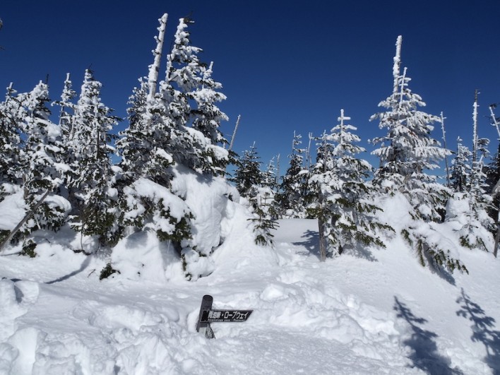 ここからは急な山道(今は雪道ですが)、縞枯山山頂に向けて樹氷の中を登って行きます。この一帯は北斜面で日差しも弱いので立派な樹氷が立ち並んでいます。その中を30分ほど登り山頂に到着しました。ご覧のように山頂の標識は先の部分しか出ていません。