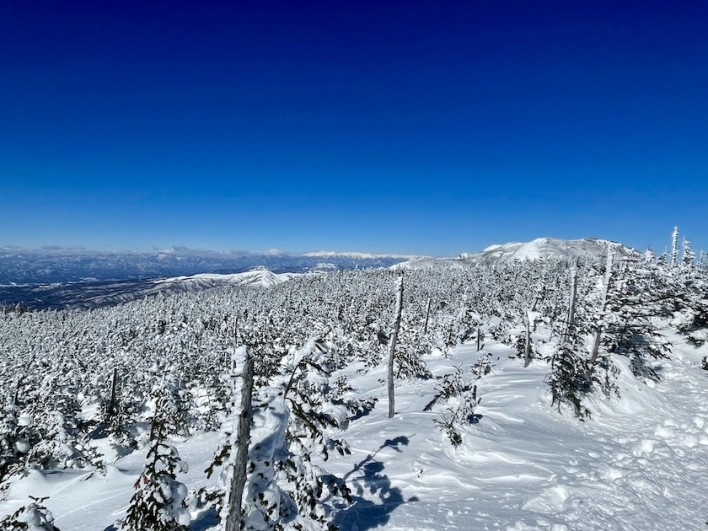手前に樹氷が広がり奥に北横岳、バックには青空と北アルプスの山々。