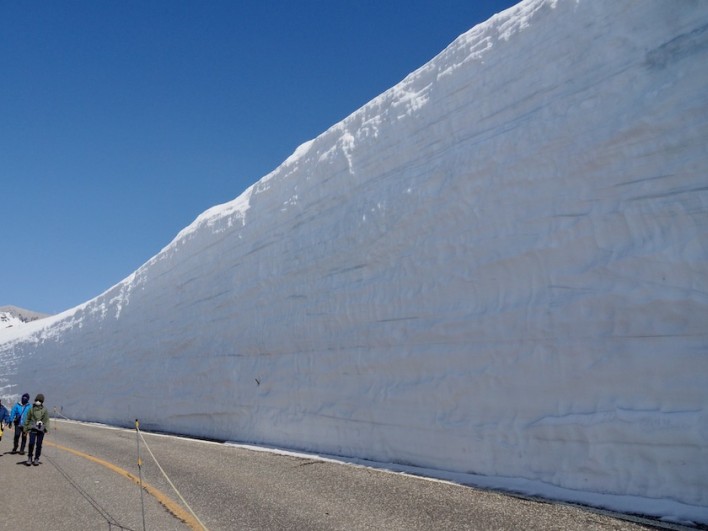 ご存知の方も多いと思いますが、立山黒部アルペンルートは北アルプス立山連峰を貫き、長野県と富山県を結ぶ山岳観光ルートです。ルートの中でも標高の一番高い(2450m)室堂付近の「大谷」では吹き溜まりになっているため積雪が20mを超えることがあります。ここを通る道路を除雪してできた巨大な雪の壁が「雪の大谷」です。