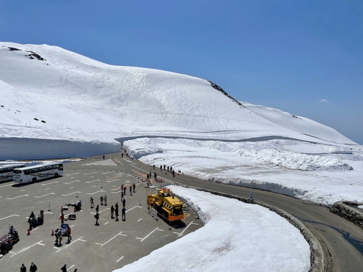 走っているバスと比べると壁の高さがよく分かりますね。この雪が完全になくなるのは7月中旬ごろになります。