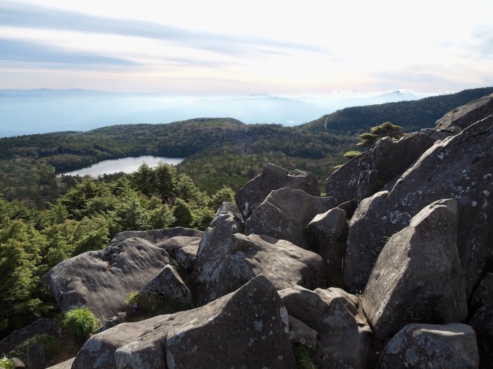そんな登山道を登り切ったところが丸山山頂(2329m)、今回で一番標高の高い地点です。山頂付近には木々は生えているのでほとんで眺望はありません。ここから少し下って行き、約1時間で高見石小屋に到着しました。小屋の横から巨大な石群を登ると高見石の最高点に到着です。眼下には白駒池、遠くは霞んでいましたが浅間山を望む事が出来ました。