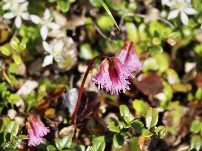 石の脇にはイワカガミとミツバオウレンが咲いていました。標高2000m以上はこれからが花の季節になります。