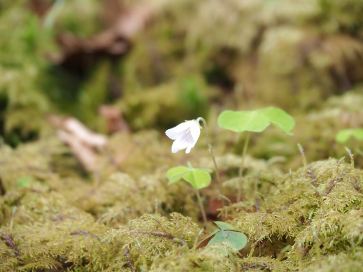 「白駒の森」では苔の中に小さな白い花を見つけました。コミヤマカタバミです。