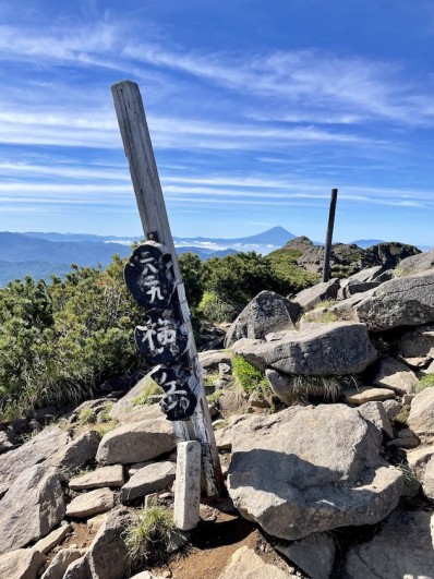 山小屋でザックを預かってもらい、いざ赤岳山頂へ。30分ほど岩場を登り赤岳山頂に到着です。念願の初登頂、雲の多めの空でしたが富士山も迎えてくれました。日は差していますが風が強く何もしていないと寒いぐらい。梅雨も明けみなさん待ちに待っていたのか、次から次へと登山者も登ってきます。私は山頂に30分程滞在し山小屋に戻ることにしました。