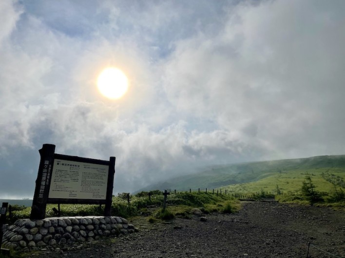 車山肩からスタート。まずは霧ヶ峰の中でも最高峰の車山(1925m)に登ります。霧ヶ峰は名の通り年間半分以上は霧が発生すると言われています。この日も霧の中のスタートとなりました。車山肩はニッコウキスゲの群生地でも有名ですが、そろそろ見頃の終盤ですが、まだたくさんの花が咲いていました。霧の中、30分ほど登り車山山頂に到着。山頂も霧に包まれていて、時折太陽も顔を出してくれましたが、視界は真っ白のままでした。