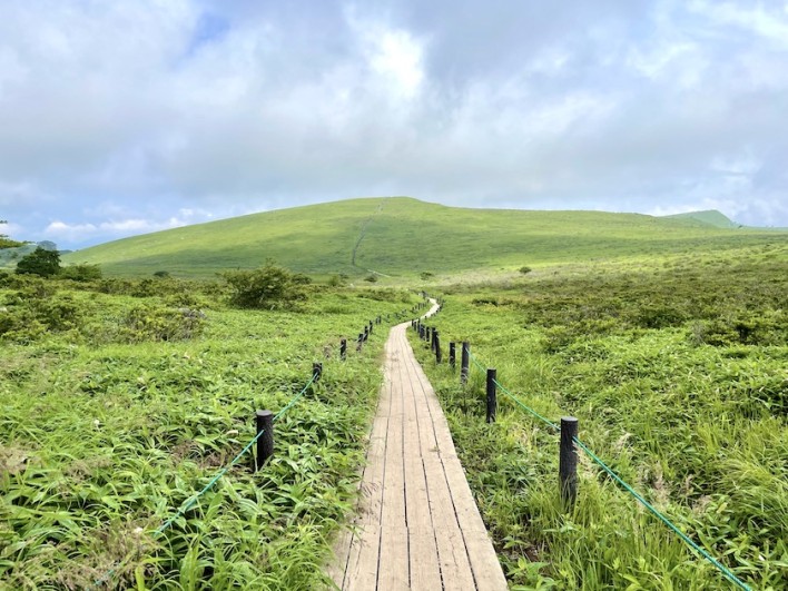いつもですと視界は晴れるまで待っていたりするのですが、今回は先があるので直ぐに出発しました。登りとは反対側のリフトのあるゲレンデ方面の登山道から下り、八島ヶ原湿原へ向かいました。ゲレンデの途中の分岐点から八島ヶ原湿原方面への道に入ります。ここからしばらくは高原の中を歩く気持ちの良いトレッキングコースになります。この頃になると霧も晴れてきて先程まで居た車山山頂の気象ドームも下から見えるようになりました。
