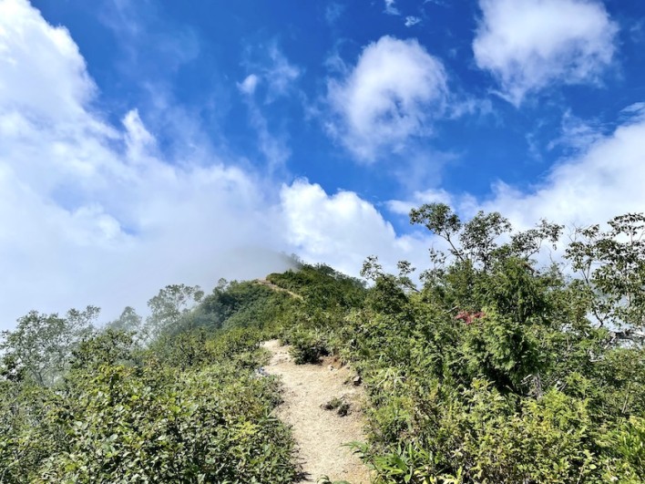 すると標高1950mあるニノ背髪あたりで急にガズが晴れ始め青空が見えて来ました。ただずーっと晴れている訳では無く、雲が入れ替わり立ち替わり流れて来て時折青空を隠します。そこから15分ほど進み小遠見山山頂に到着しました。