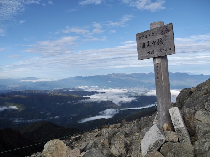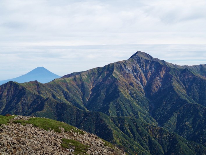スタートから約3時間で小仙丈ヶ岳に到着、標高は2864m。小仙丈ヶ岳からは最終目的地の仙丈ヶ岳も見え、東の方角には日本一の山、富士山が。そしてその手前には日本二位の山、北岳が並んで見えます。