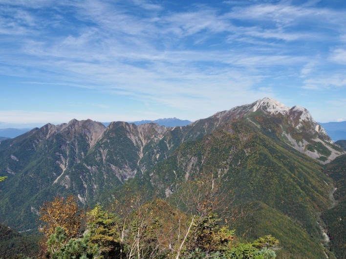 スタートしてから2時間半ほどはシラビソやコメツガなどの樹林帯の中を登って行きます。樹林帯を抜けると今度は少し背の高いハイマツ帯に入ります。この辺りから周囲もひらけ眺望が良くなって来ます。登って来た方向を振り返ると白い山肌と紅葉の甲斐駒ヶ岳が見えました。その奥には八ヶ岳連峰も。