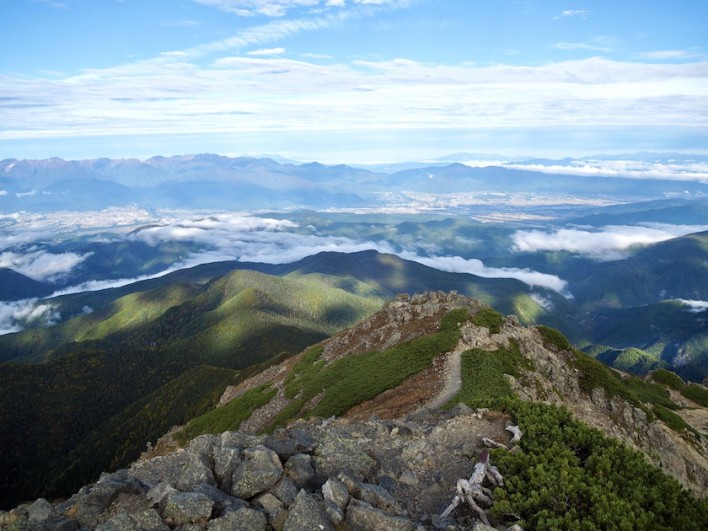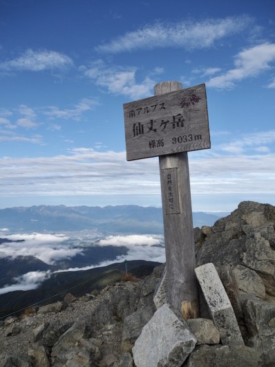 6時半に山小屋を出発。仙丈ヶ岳山頂までは30分程、無事に山頂に到着。今シーズンは初の3000m越えです。標高は3033m、日本で18番目に高い山です。