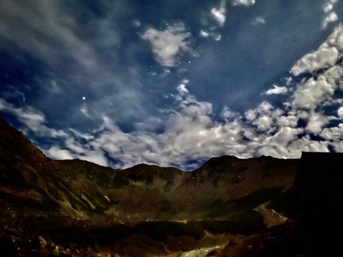 2日目(10月12日)。夜中にトイレが屋外にあるので外に出ると月夜で、雲は多めでしたが月夜で月光が山小屋のある藪沢カールを照らしていました。