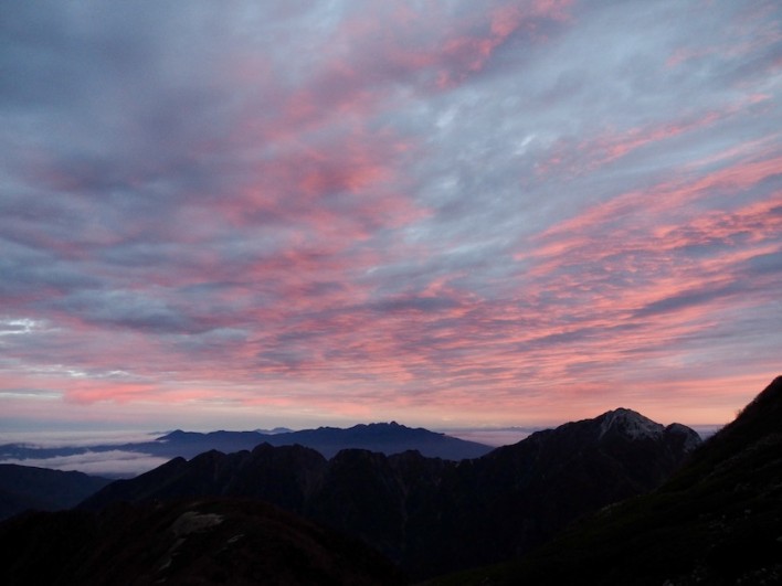 起床は4時半。山小屋からは角度的に日の出は見えないので朝食前に見える位置に移動しなければなりませんでしたが、夜中と変わらず雲が多めでご来光は望めそうになかったので、諦めゆっくり朝食を頂くことに。それでも山小屋からはキレイな朝焼けが見ることが出来ました。