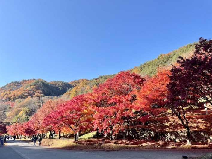 駐車場に戻ると到着時には日陰だった所にも日が当たり、色鮮やかになっていました。なのでもう一度「もみじのトンネル」へ。