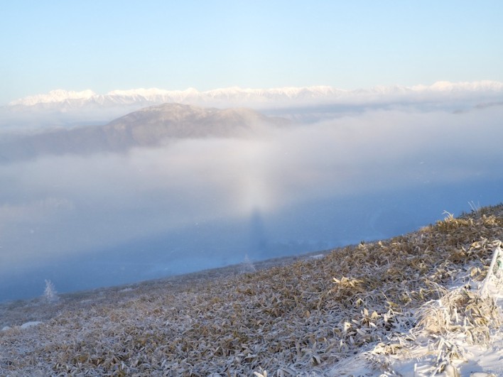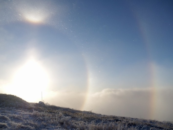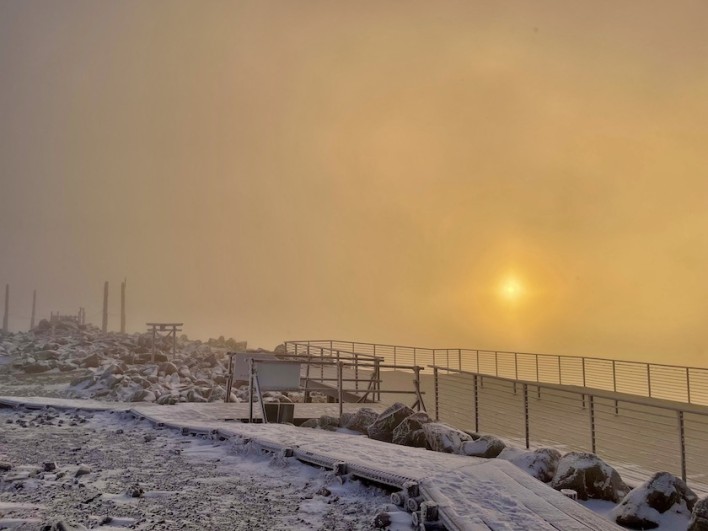 この日の前日(12月11日)には蓼科高原でも雪が舞い、蓼科では積雪まではいきませんでしたが車山辺りはきっと雪が積もっていると思い、今シーズン初のスノートレッキングに出かけたのですが、まさかこんな不思議な現象達に会うとは思いませんでした。当初は日の出を見ようと思い登ったのですが、山頂はガスっていて一瞬だけ昇りたての太陽が顔を出してくれました。このあとの下山中に幻の太陽やブロッケン現象と出会いました。