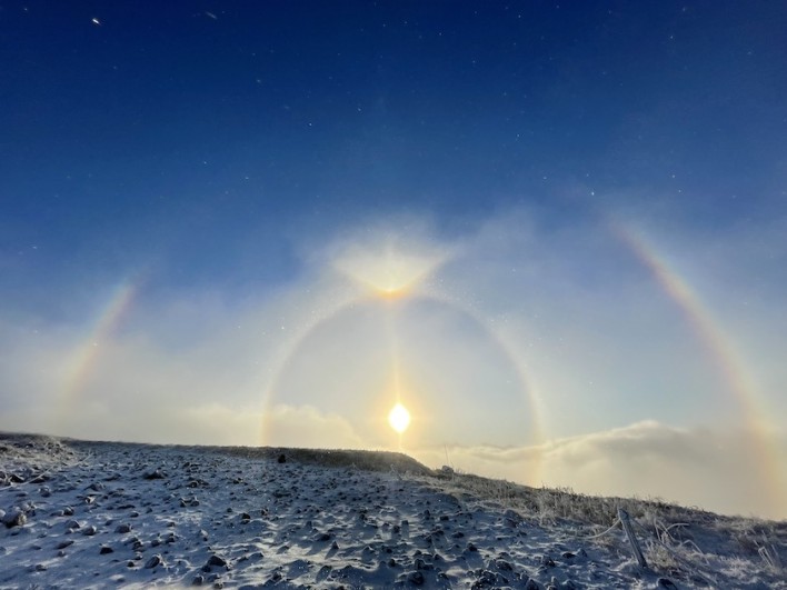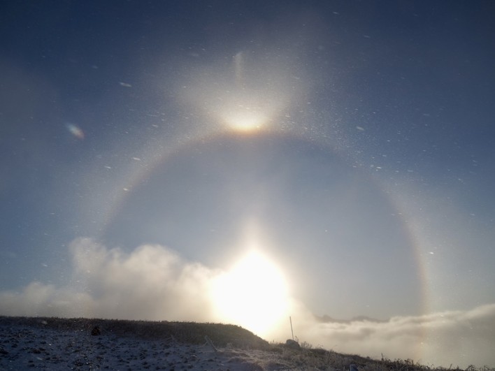 太陽の周りに虹が2重にかかり、太陽の上もう一つの太陽?が輝いています。